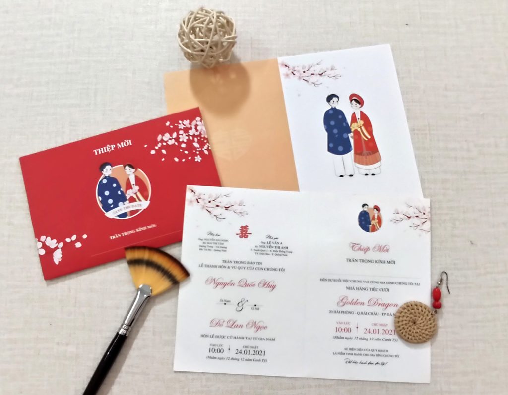 Thiệp cưới giá rẻ tại Đà Nẵng có nhiều mẫu mã phong phú như Thiệp thiết kế nhưng đã in sẵn hoa văn, hình ảnh hoạt hình v.v… chỉ in nội dung vào trong thiệp nên thiệp có giá thành hợp lý so với thiệp thiết kế.