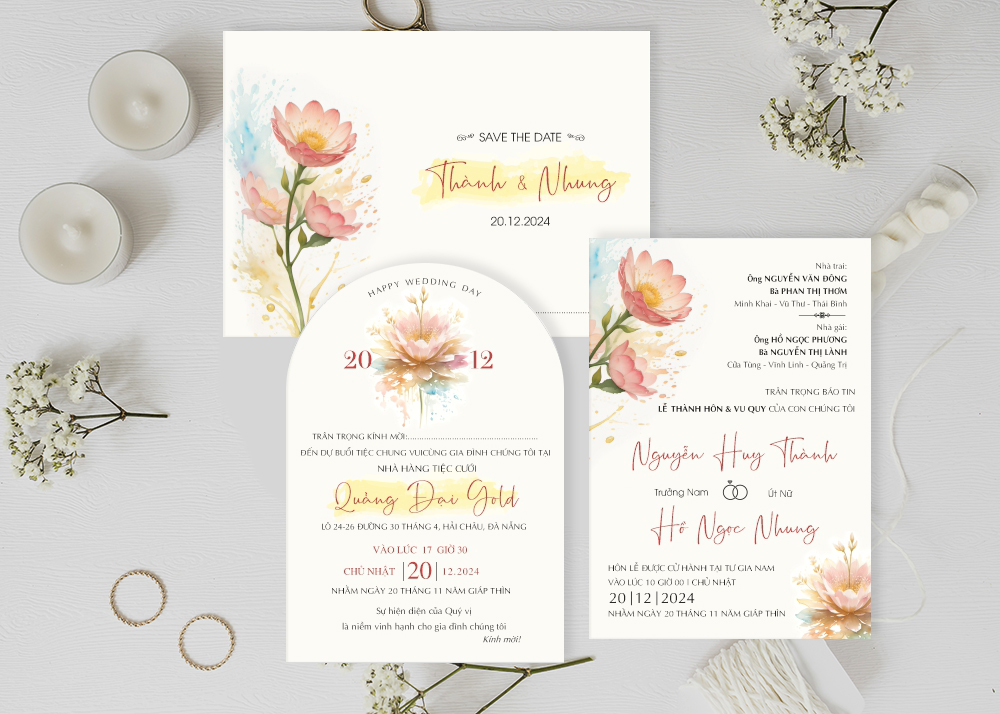Thiệp cưới Đà Nẵng – Rồng vàng sẽ cung mang đến cho bạn mẫu thiệp cưới hoa sen thanh lịch và quý phái