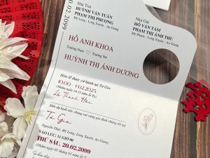 - Mặt ngoài: Tên cô dâu chú rể nổi bật với font chữ thư pháp lãng mạn, thông tin địa điểm & ngày cưới trang trọng